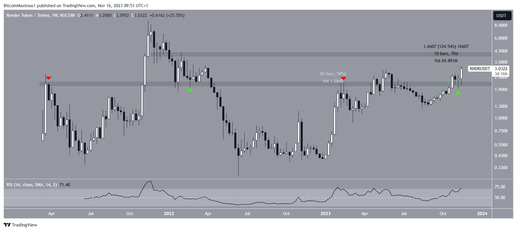 After validating it as support next week (green icon), the RNDR price accelerated its rate of increase this week. The RNDR high of $3.20 is a new yearly high and the highest price in nearly 600 days.