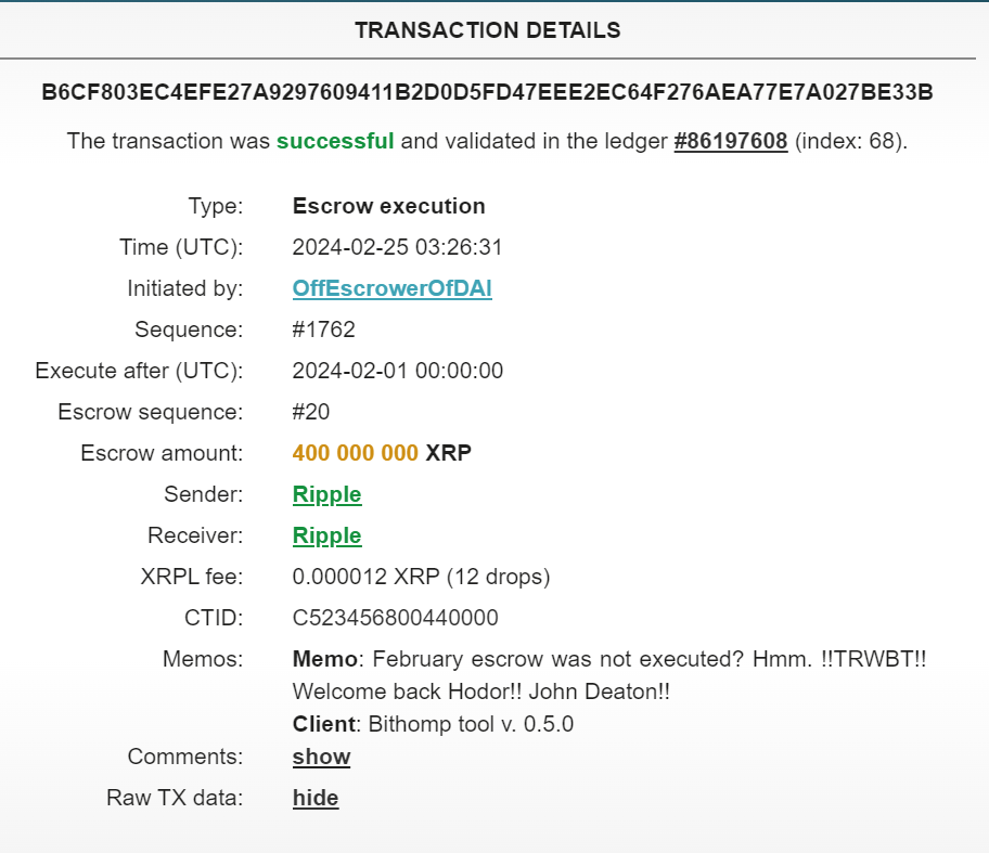 This sizeable transaction has stirred curiosity among the community due to its unusual timing and the enigmatic memo accompanying it. The memo raised questions about the platform’s February escrow execution and contained peculiar shout-outs.