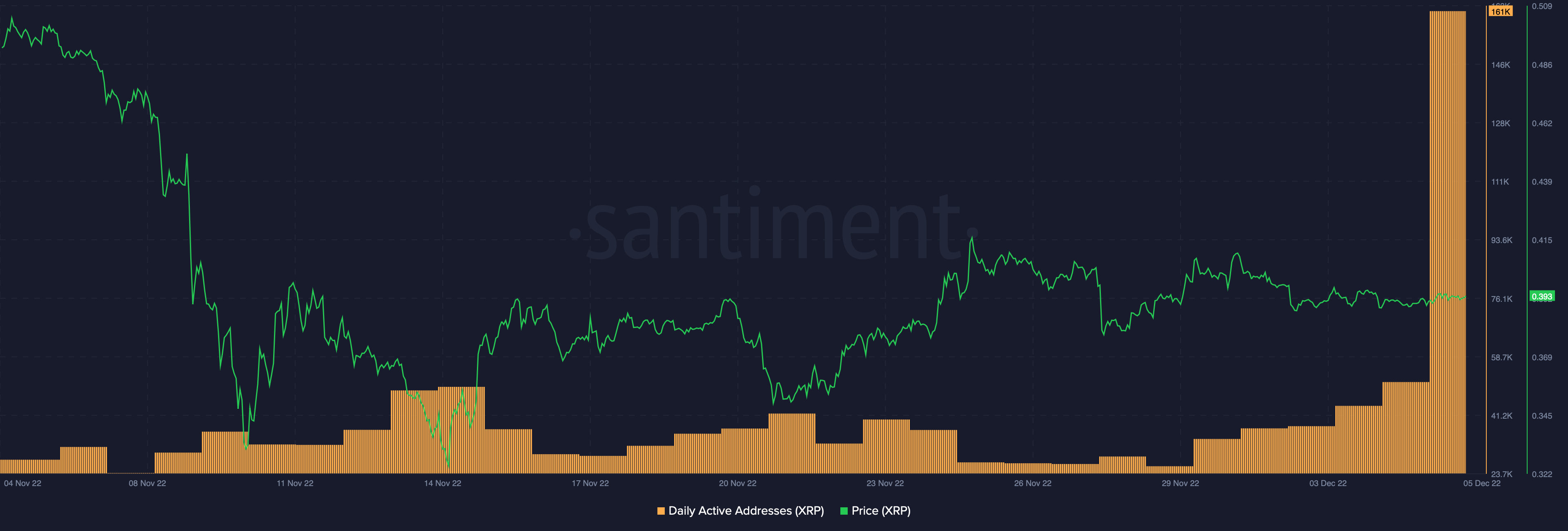 Alongside higher trade volumes, the XRP daily active addresses (DAA) noted a significant spike appreciating by almost 200%. XRP DAA was making higher highs since Nov. 30, and appreciated from 51,161 on Dec. 4 to 161,000 at the time of writing.