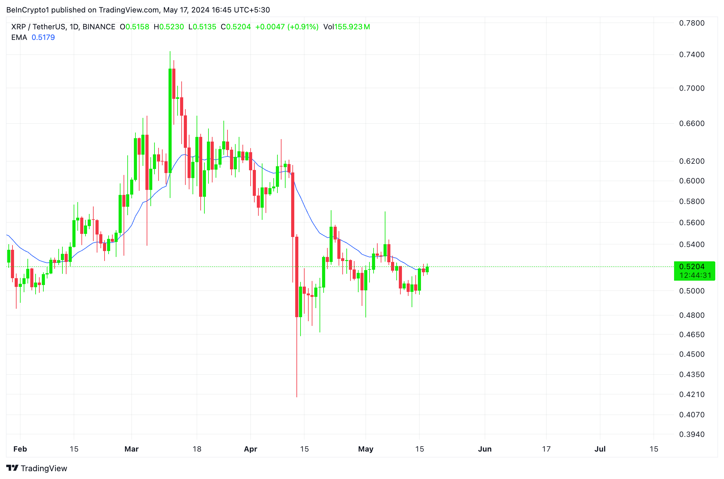 SponsoredIn fact, on May 16, XRP’s price climbed above its 20-day Exponential Moving Average (EMA), which is where it currently trades.