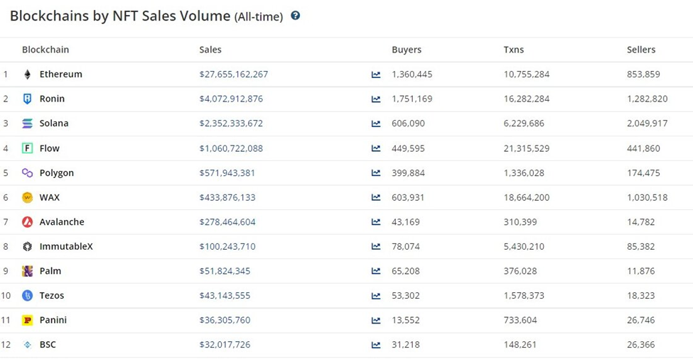 Ronin reached a new milestone in the non-fungible token (NFT) space trailing only Ethereum as the biggest blockchain by all-time sales volume.