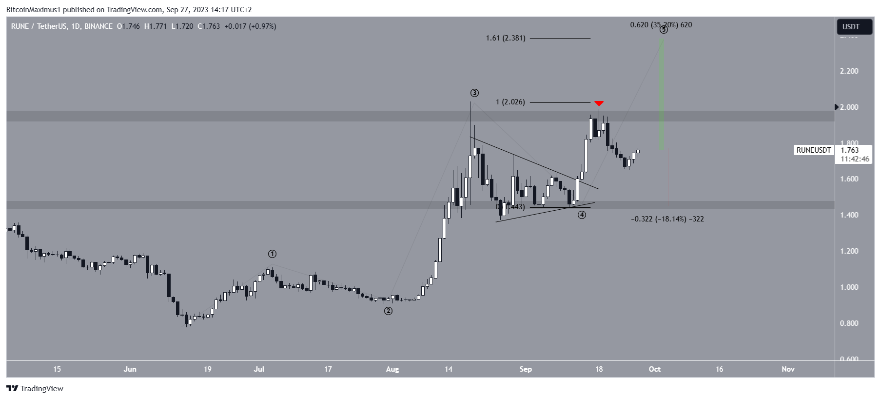 SponsoredIf the count is correct, the RUNE price can reach a high near $2.40, 35% above the current price. The target is found by wave four’s 1.61 external Fib retracement (black).