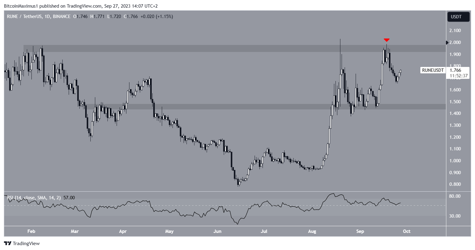 THORChain (RUNE) has traded in a range between $1.45 and $1.05 since the beginning of August. More recently, the price reached the top of the range on September 18 but faced rejection.