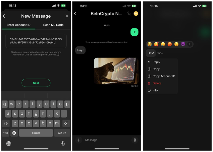 Adding new chats is also simple: connect with others via QR code, username, or account ID. There’s also a chat request system — incoming messages go to a request inbox first, and you decide whether to accept or ignore them. Inside conversations, you’ll find familiar features like GIFs, voice messages, emoji reactions, and file attachments — including videos, photos, and PDFs.