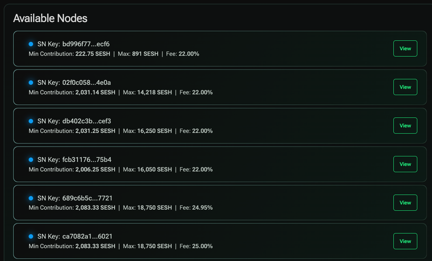 The required staking amount to run a full node is 25,000 SESH, but you can also launch a node collaboratively with up to 10 contributors. If you are a node operator with contributors, you can set a custom operator fee to cover node expenses.