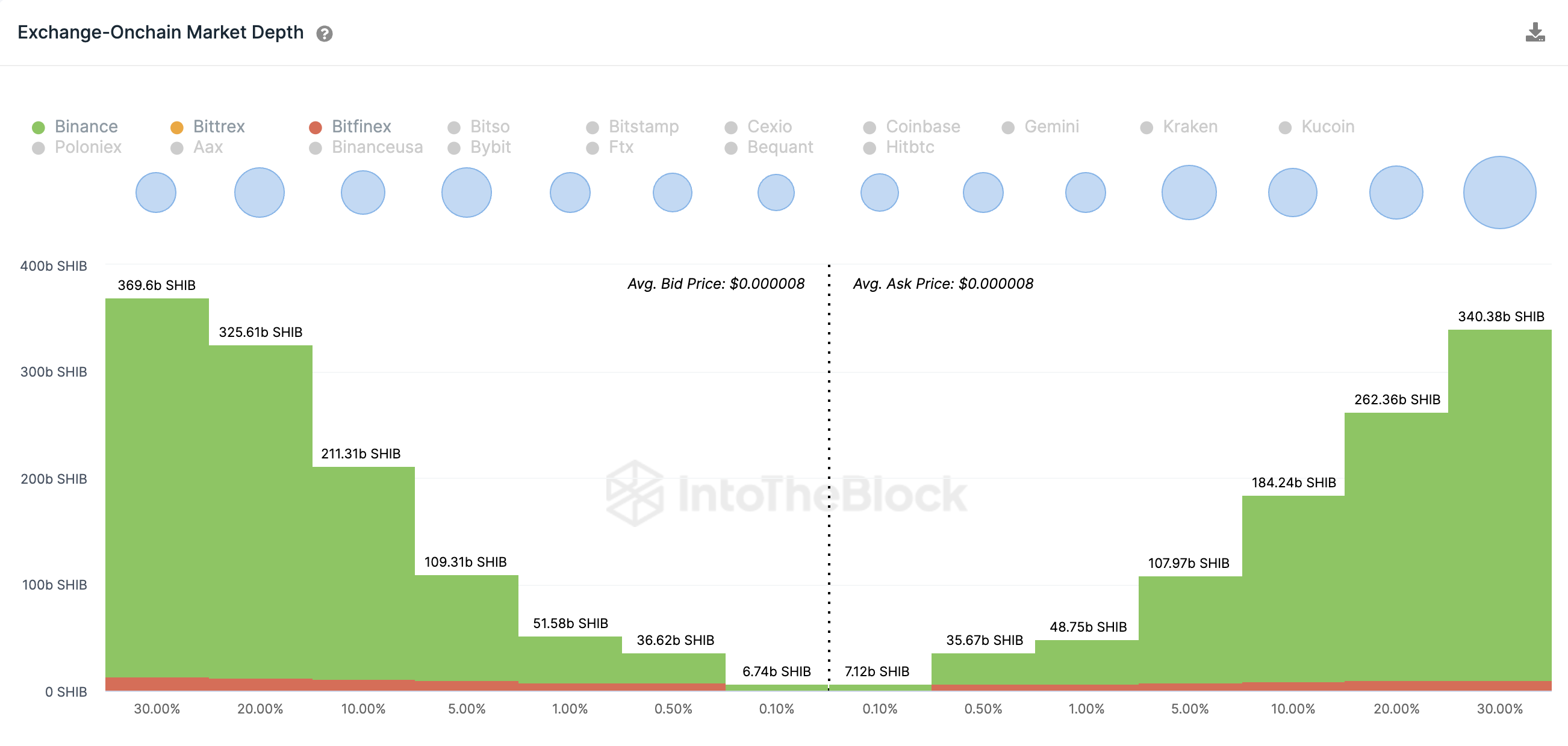 The Exchange on-chain Market depth chart shows an aggregate of the total buy/sell orders placed by SHIB holders across different crypto exchanges.