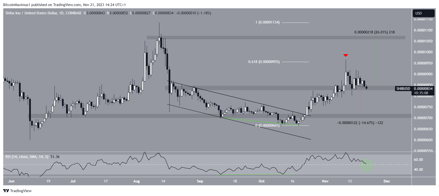 The Shiba Inu (SHIB) price has fallen since a confluence of resistance levels rejected it on November 12.