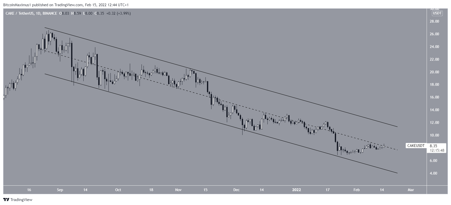 CAKE has been decreasing inside a descending parallel channel since Aug 2020. The downward movement led to an all-time low price of $6.81 on Jan 22. The low served to validate the support line of the channel.