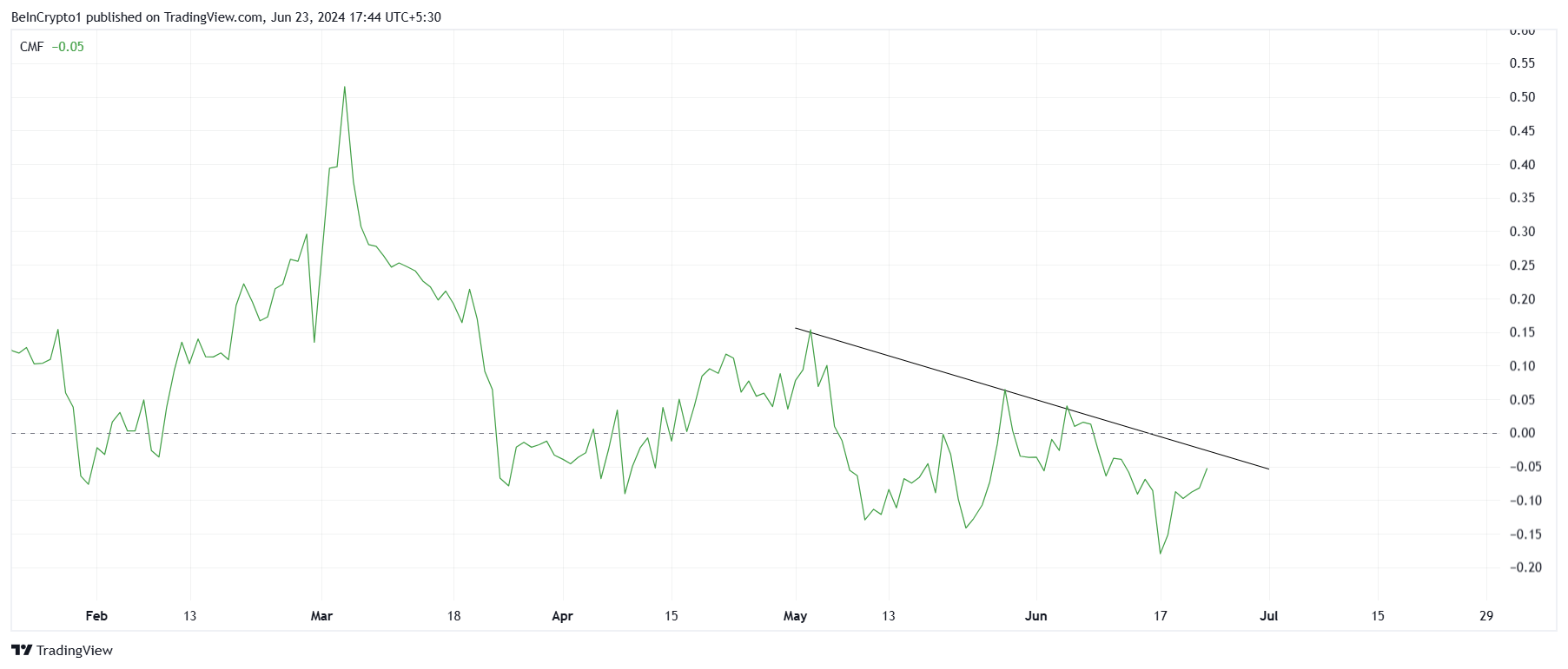 This indicator, which measures the accumulation and distribution of a cryptocurrency, is currently below the neutral line. This highlights increasing bearish sentiment among investors.