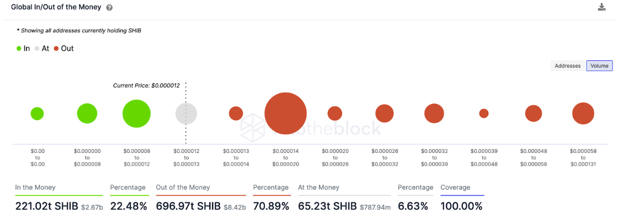 The Global In/Out of Money Around Price (IOMAP) by IntoTheBlock shows that the market can anticipate a further decline if SHIB breaks below its current support at $0.000010. The next area of demand could be around $0.000006, where 164,000 addresses bought nearly 55 trillion SHIB.