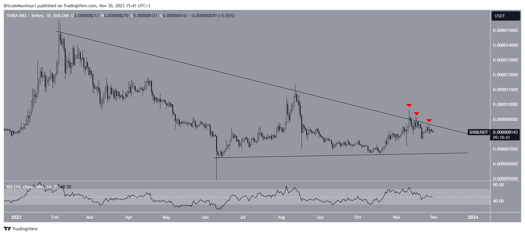 Following the latest rejection on Nov. 27, SHIB’s price has experienced a further drop. Since June, there has been an ascending support trend line, establishing a symmetrical triangle when combined with the resistance above.