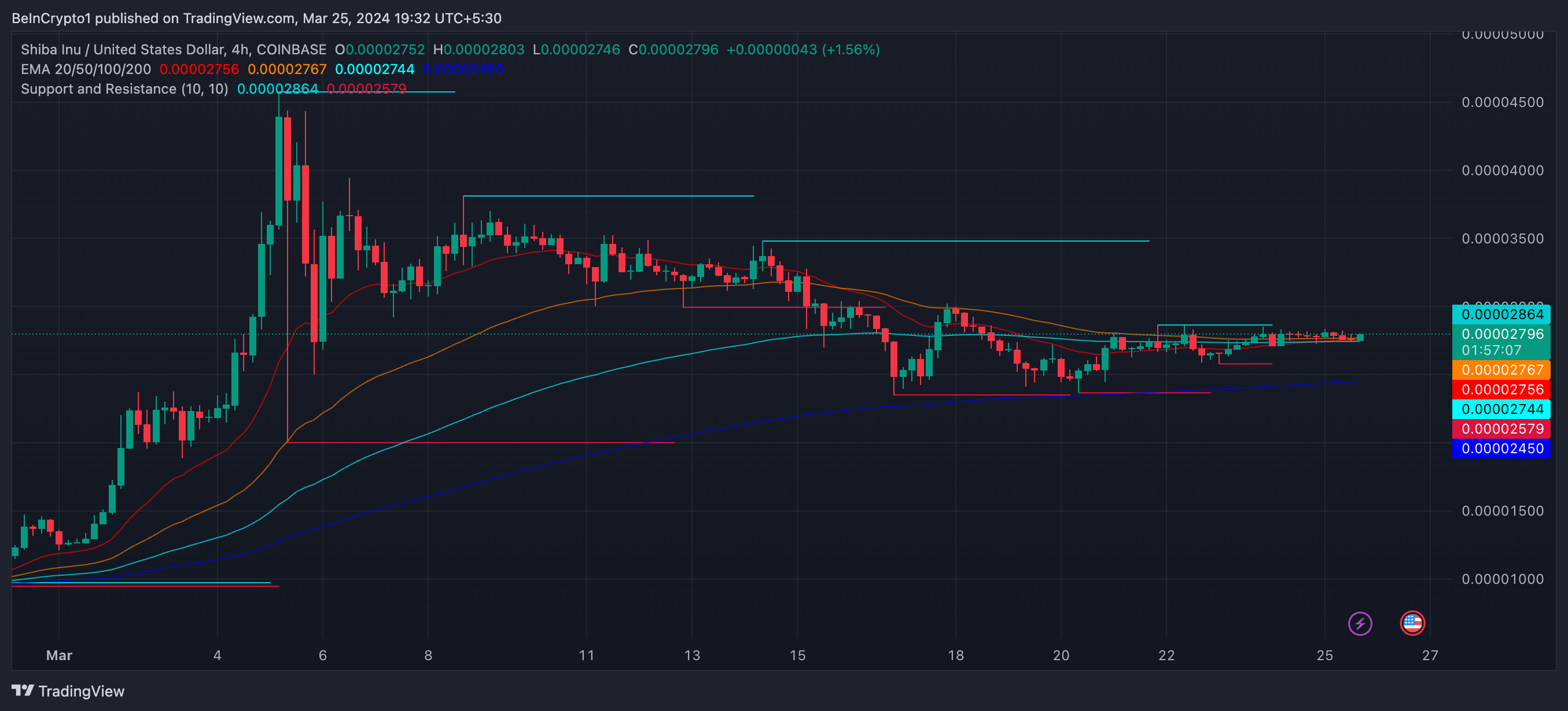 SHIB exhibits a potentially bearish technical indicator based on its Exponential Moving Averages (EMAs). The short-term EMAs are approaching a crossover below the long-term EMAs. This technical analysis suggests a possible decline in price if the current trend persists.