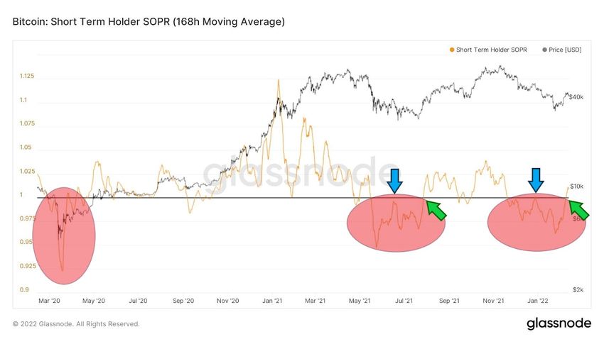 The 7-day moving average of this indicator presents a similar perspective to the chart of the 14-day moving average of the SOPR discussed in the first section. Here we similarly see the March capitulation and parallels between the May-July 2021 period and the current correction. Equally, there was a failed attempt to break out above 1 (blue arrows) and a successful breakout of that level (green arrows).
