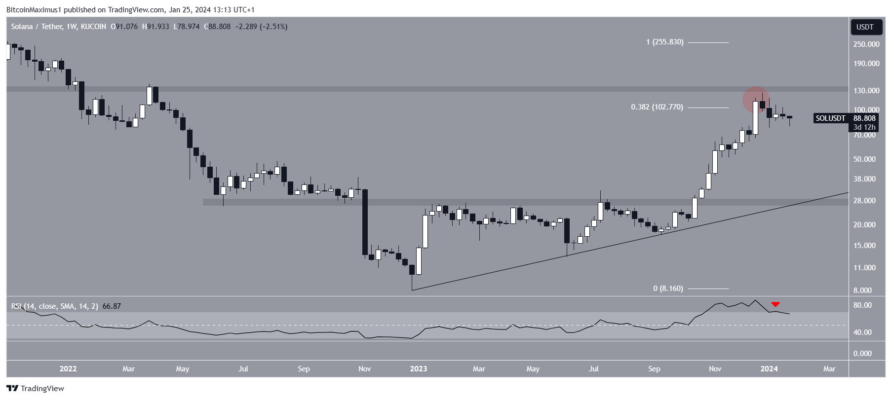 The upward movement led to a yearly high of $126 in the year’s final week. The high was made just above the 0.382 Fib retracement resistance level. However, the SOL price has fallen since. It deviated above the Fib resistance mentioned above (red circle).