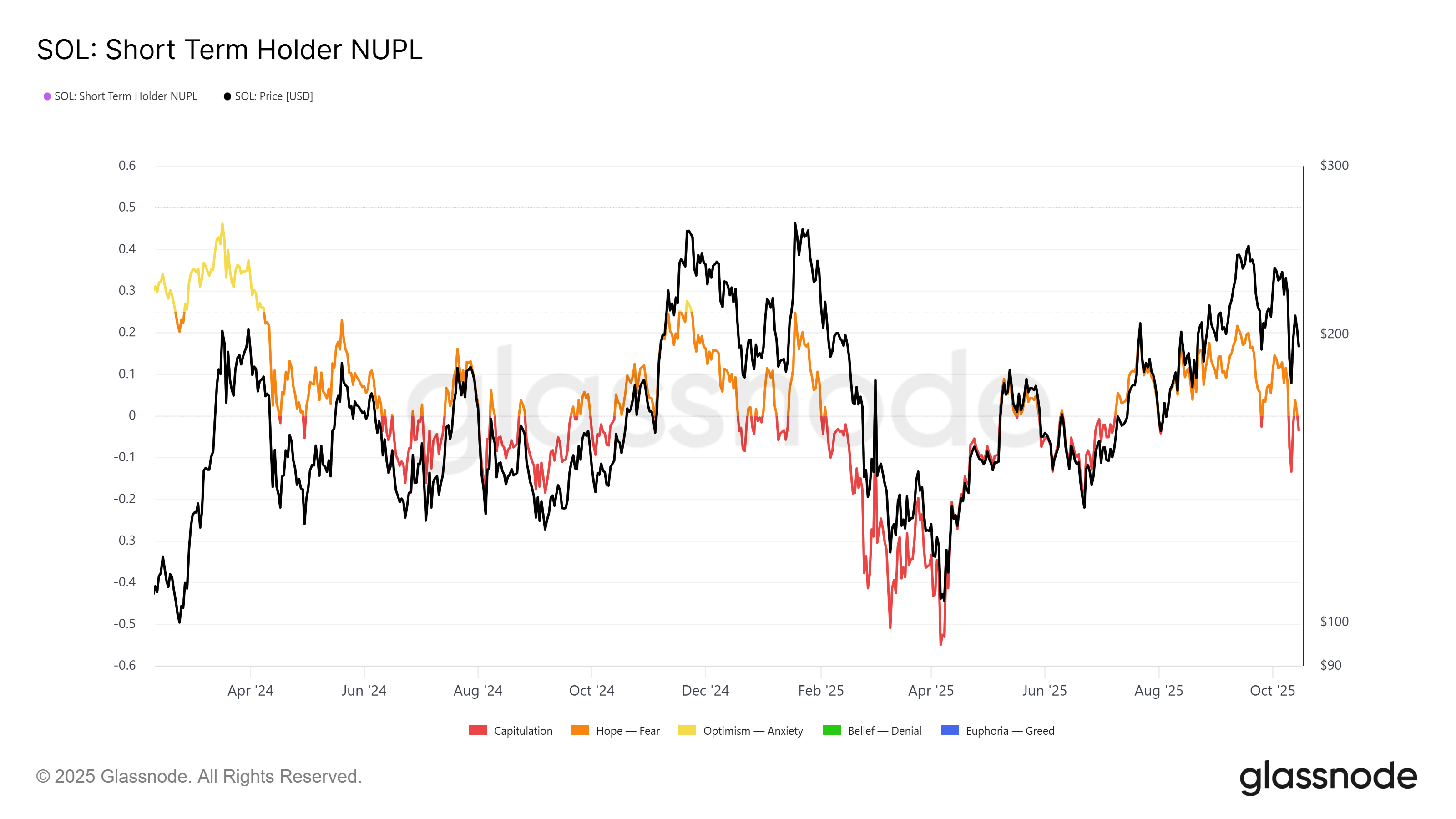 The short-term holder Net Unrealized Profit/Loss (STH NUPL) indicator currently sits in the capitulation zone, signaling that most short-term holders are selling at a loss. Historically, when this occurs during a broadly positive market, it has marked the beginning of a rebound phase. This pattern has been observed multiple times in Solana’s previous cycles.