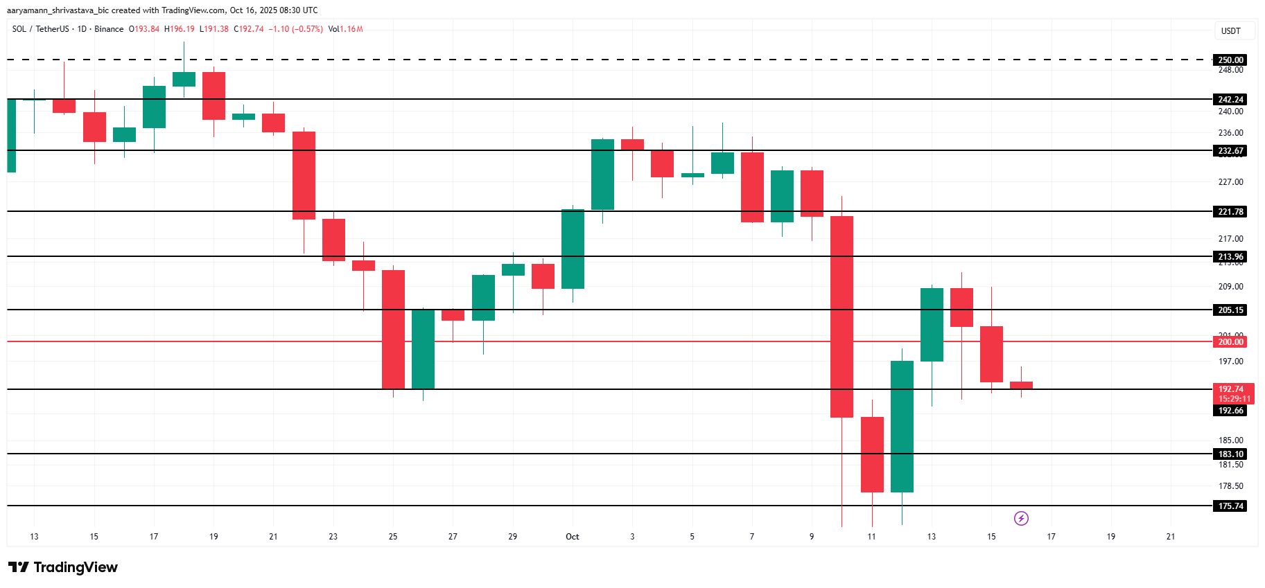 Solana’s price currently stands at $192, holding just above a key support level at the same mark. The altcoin recently dipped after failing to secure a foothold above $200, but resilience at this level remains a positive sign.
