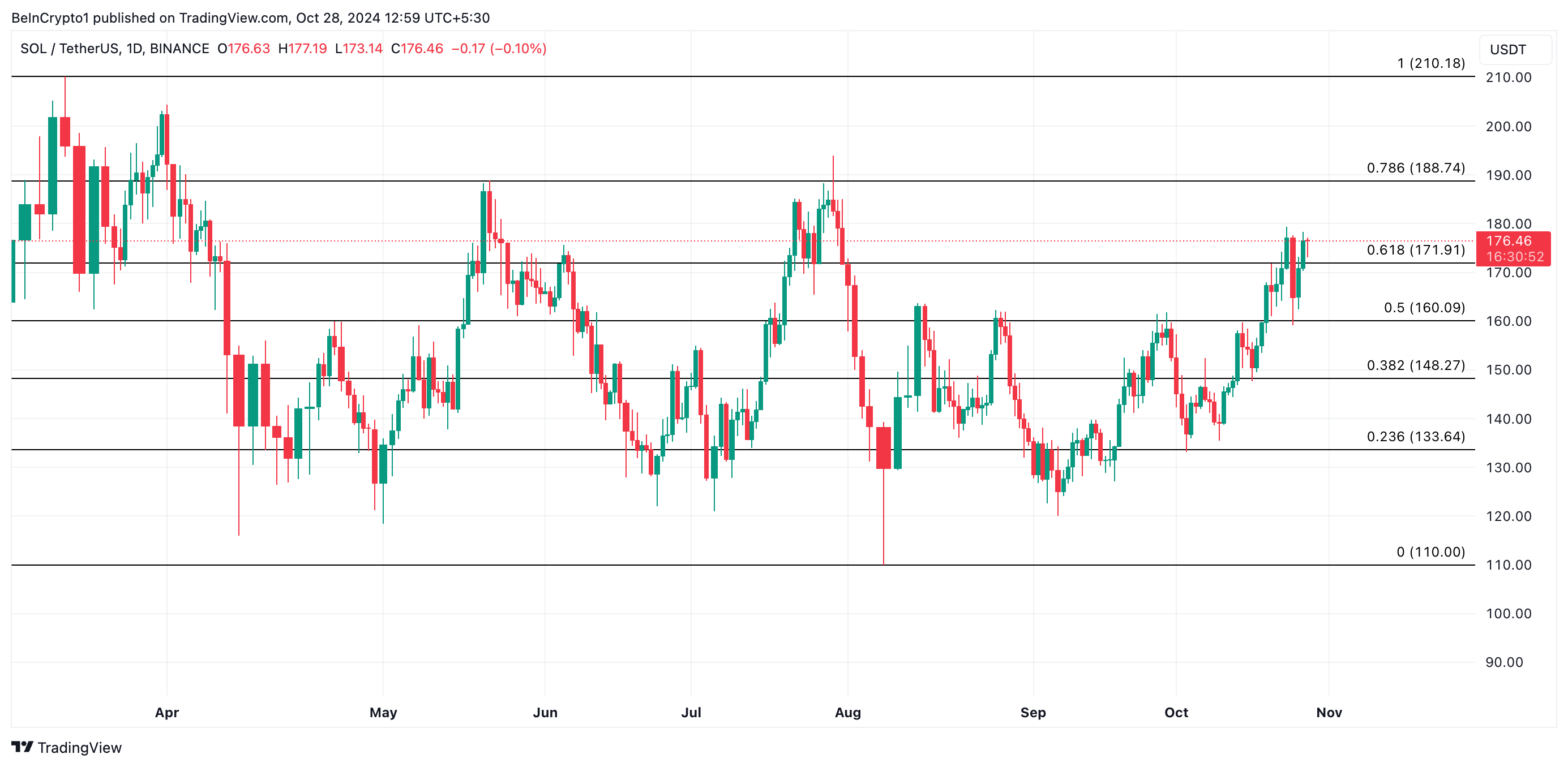 At press time, Solana trades at $176.46, just above the key support level of $171.91. If the level continues to hold as support, it could pave the way for Solana’s price to rally toward resistance at $188.74. A successful breakout above this level could propel Solana’s price toward $210.18, a high it last reached on March 18.