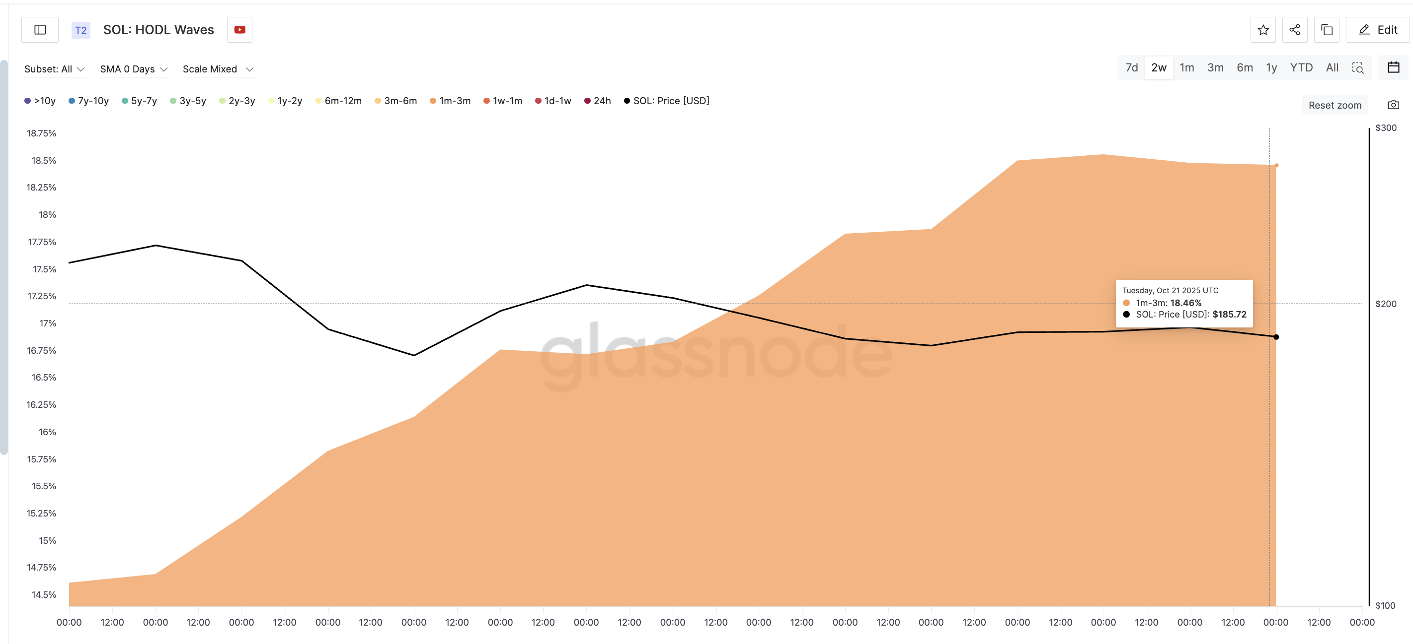 Over the past two weeks, wallets holding SOL for one to three months have increased their share from 14.61% on October 7 to 18.46% on October 21, a gain of roughly 26%, showing clear accumulation near recent lows.