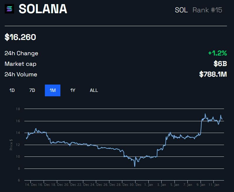 SOL prices are up a percentage or so on the day to trade at $16.26 at the time of writing. However, it has failed to add to the gains sending it to this level on Jan. 9.