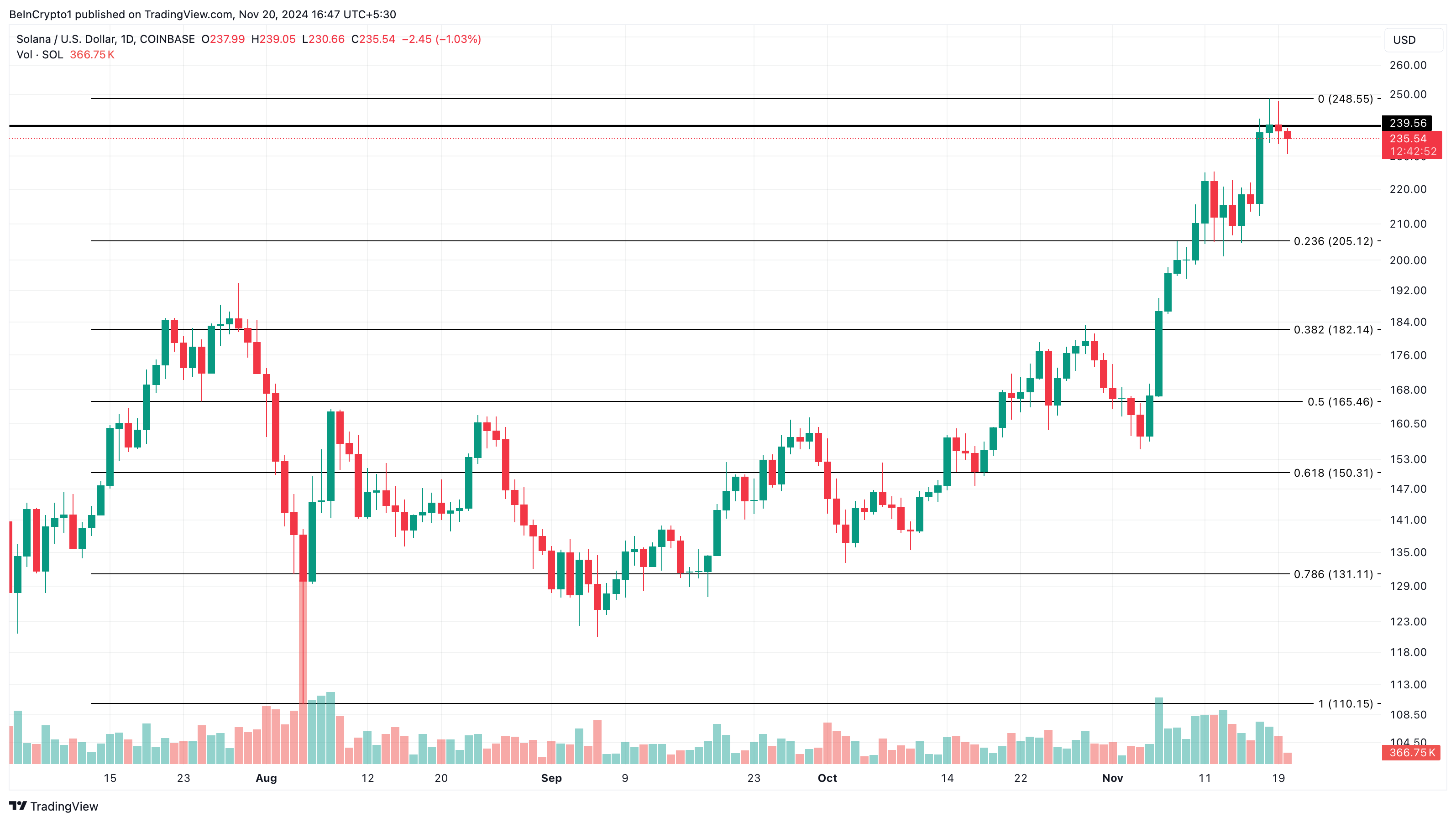 On the daily chart, Solana’s price faced resistance at $239.56 as it attempted to climb toward $260. Due to this development, SOL might not find it easy to hit its all-time high in the short-term