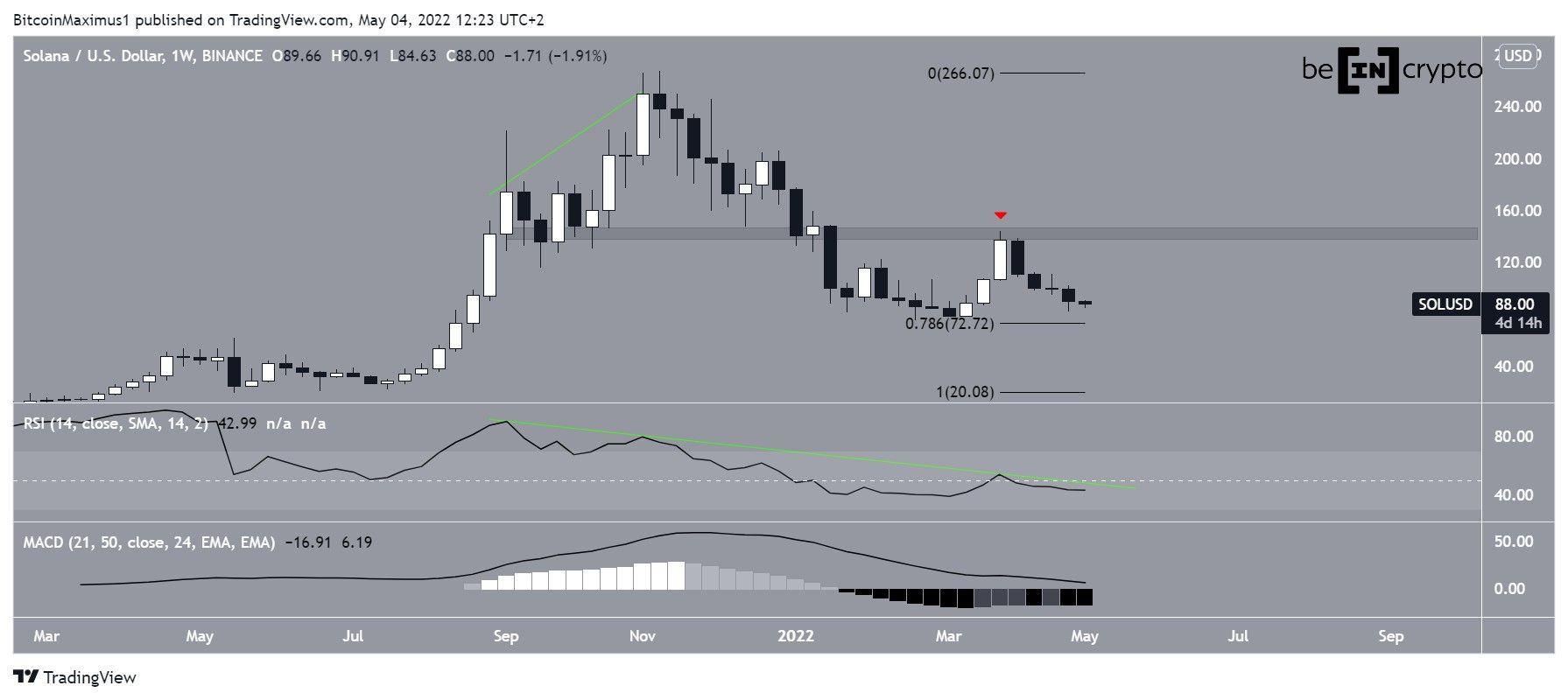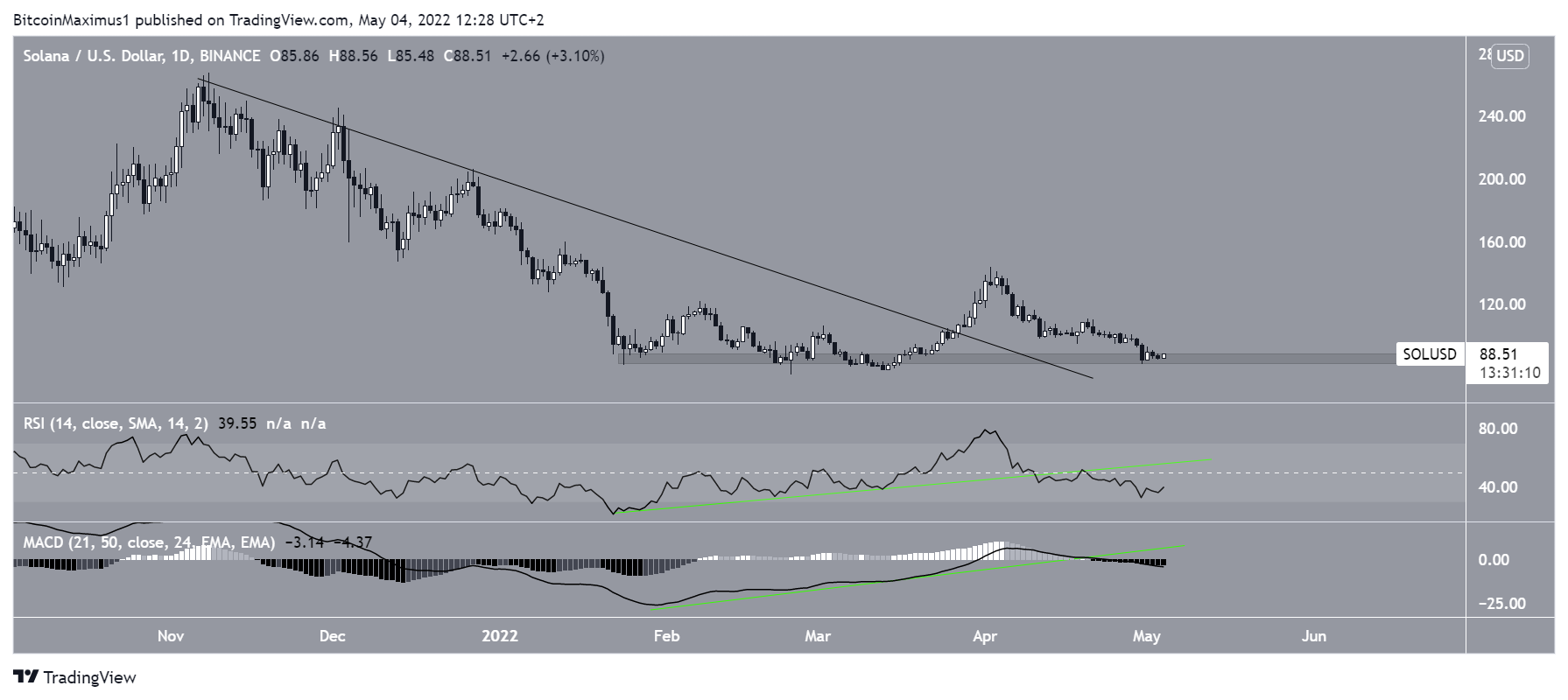 Technical indicators in the daily time frame are bearish. While both the RSI and MACD had generated bullish divergences prior to the breakout, their trendlines are not intact. This is a bearish sign, suggesting that the bullish structure for SOL is not intact either, despite the breakout from the descending resistance line.