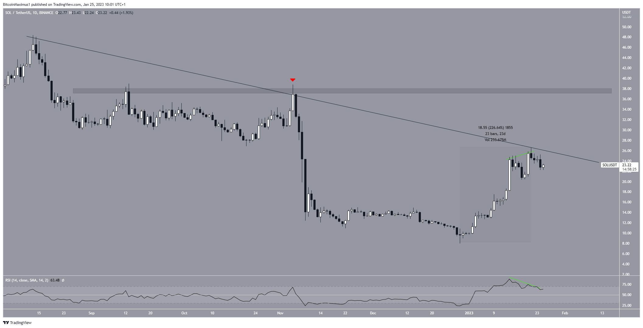 The Solana price has decreased under a descending resistance line since Aug. 13. More recently, the line caused a rejection at the beginning of Nov., leading to a minimum price of $8 on Dec. 29. The price initiated a massive upward movement afterward and has increased by 225% since.