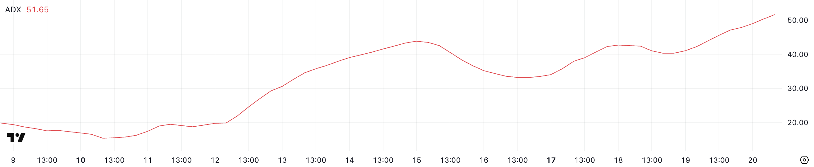 Sonic, formerly Fantom (FMT), ADX is currently at 51.6, showing a significant increase from 34 just three days ago and an even more dramatic rise from 19.8 eight days ago.