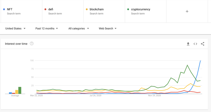 More widely, the NFT-space is surging in popularity. To date, over $400 million worth of NFTs (excluding the Beeple collection sale) have been sold, with Google searches for “NFT” overtaking “cryptocurrency” and “blockchain.”
