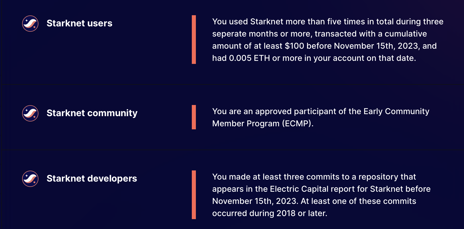 SponsoredStarknet’s website outlines strict criteria determining participant eligibility.