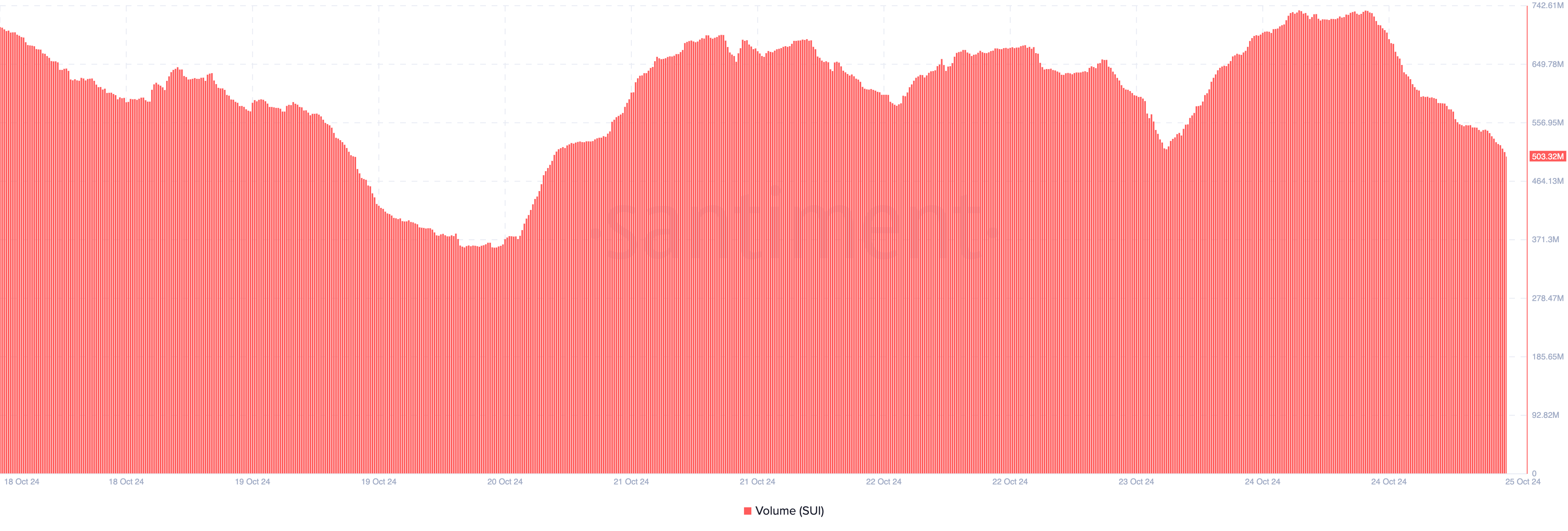 On October 24, Sui’s trading volume was over $700 million. However, as of this writing, the metric has dropped to $503.32 million, representing a 30% decline within the mentioned timeframe.