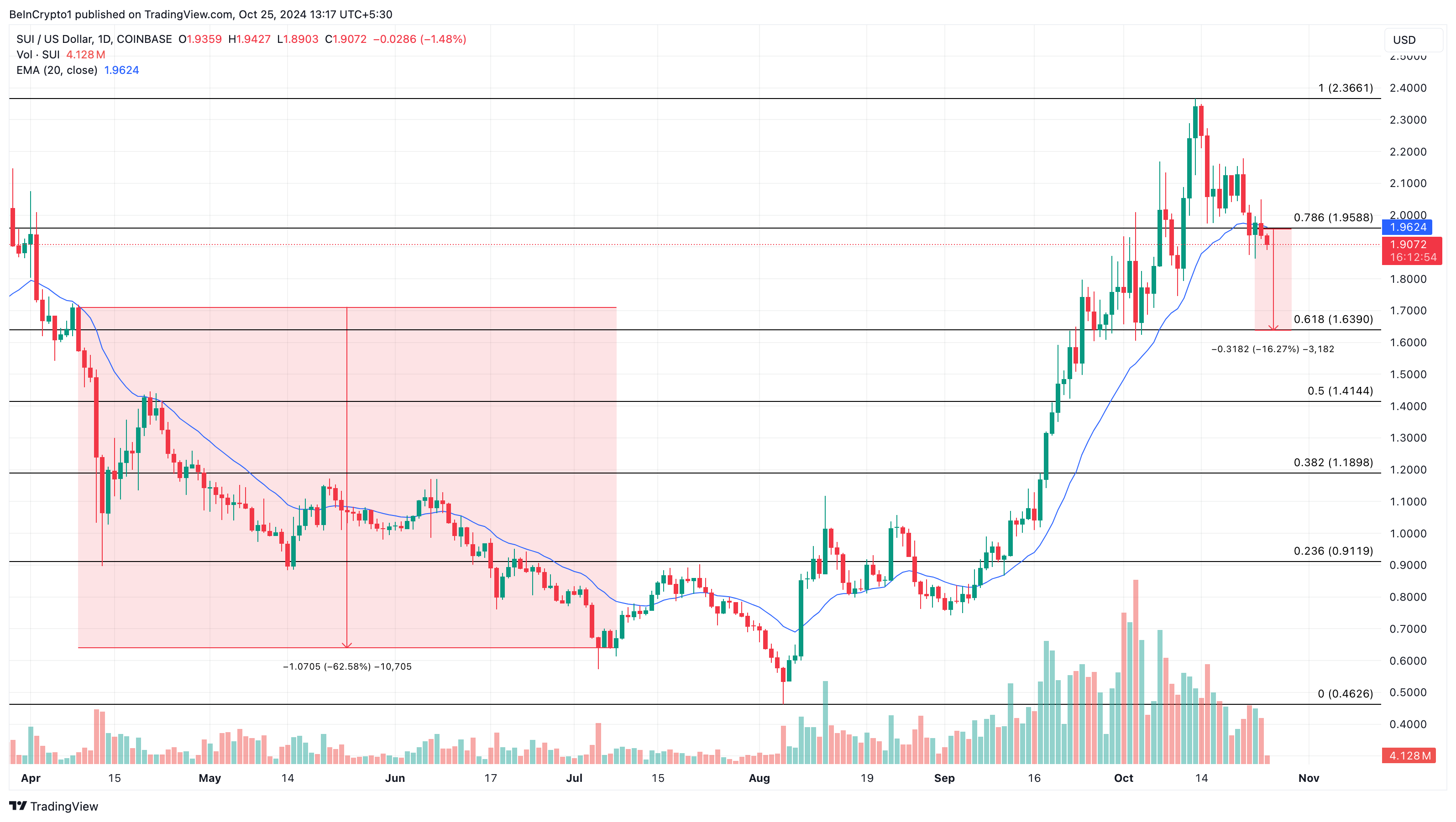 Based on the daily chart, SUI’s price has fallen below the 20-day Exponential Moving Average (EMA) for the first time since April. The last time this happened, SUI’s price plunged by 62% within four months.