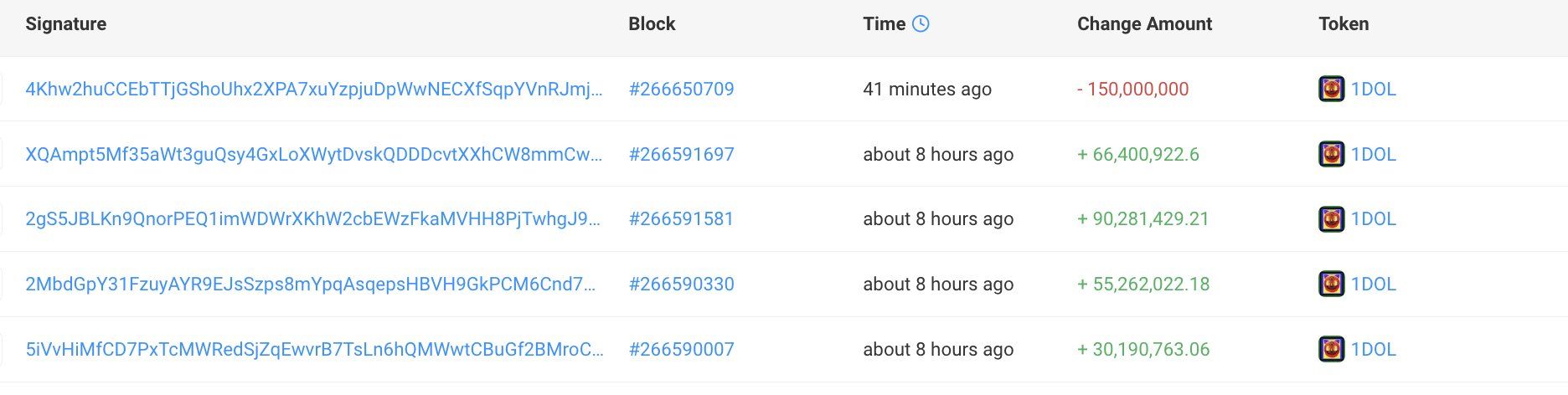 According to Lookonchain, the address sundayfunday.sol turned 13 Solana (SOL), worth about $2,275, into $2.26 million in just 8 hours by buying the 1DOL meme coin. From this transaction, they earned a staggering 993x return.