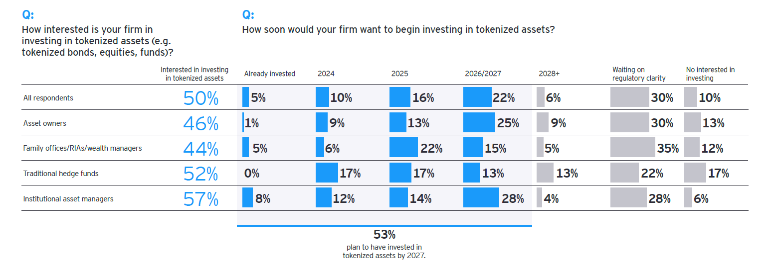 “Across all investor types, 53% wish to invest in tokenized alternative funds, 46% in tokenized public funds, and 38% are interested in investing in tokenized real estate investments. When asked about the top motivation for interest in tokenized assets, portfolio diversification was most important, followed by access to new asset types and greater/increased liquidity,” EY analysts wrote in the report.