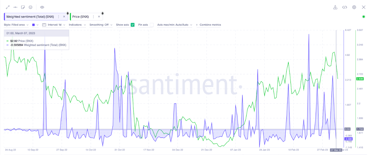 On March 6, SNX reached a 6-month peak of $3.2, which sent its year-to-date performance above 120%. According to recent data compiled by blockchain analytics firm, Santiment, the perception surrounding SNX is largely optimistic.
