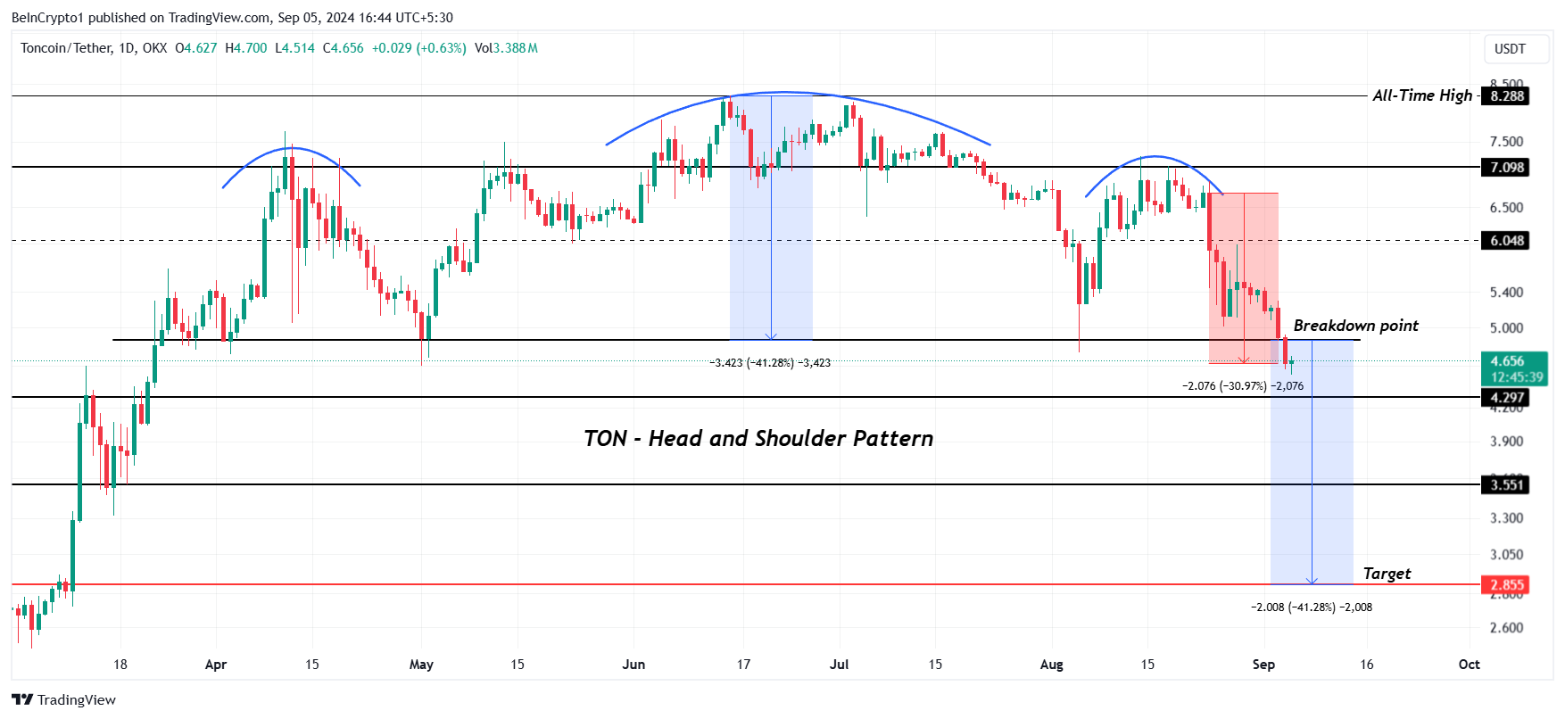 However, a deeper drawdown is likely if Toncoin loses the $4.29 support. Technical patterns indicate the potential for a 41% drop, which would bring TON down to $2.85.