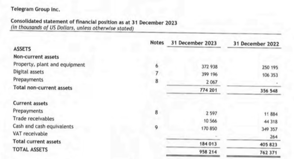 Telegram’s financial reports also show that the company holds $399.2 million in crypto assets, a sharp increase from $106.35 million in 2022. In contrast, its cash and cash equivalents for 2023 amounted to only $170.85 million, while real estate and equipment assets were valued at $372.94 million. This data suggests that crypto is now Telegram’s most valuable asset.
