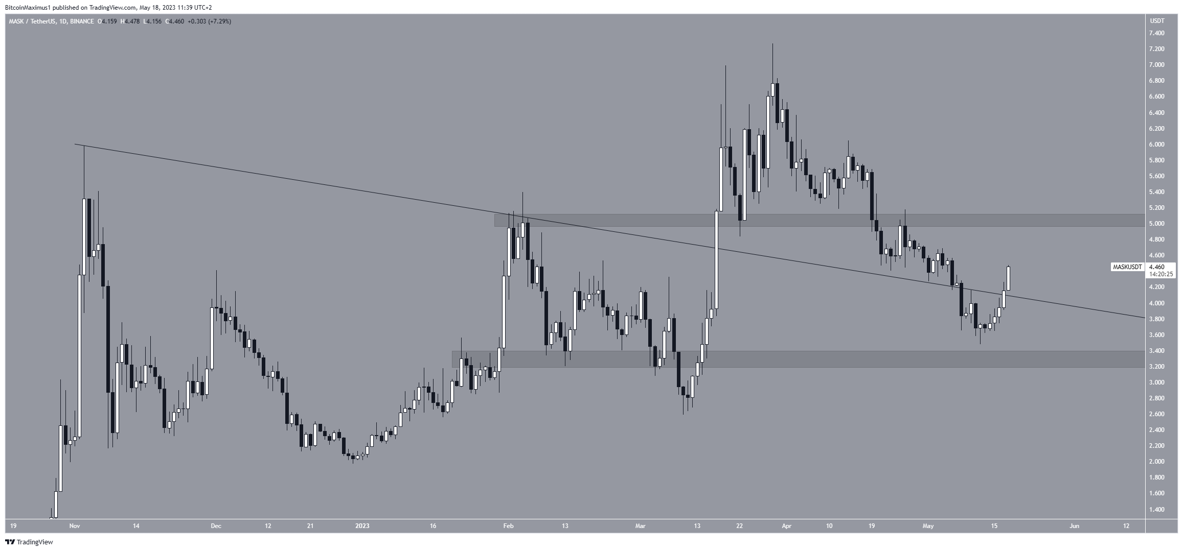 The MASK price has fallen since March 29, when it just reached a new yearly high of $7.27. Initially, the price was expected to bounce at the previous descending resistance line. However, it failed to do so and instead broke down.
