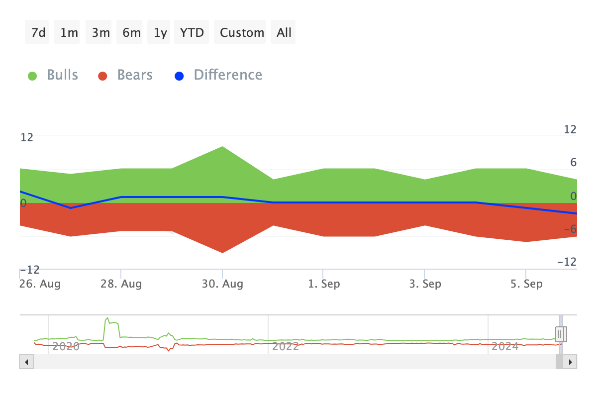 Adding to this outlook is the Bulls and Bears indicator, which tracks whether addresses trading about 1% of the total volume are buying or selling. Bulls represent addresses that purchased more than 1% of the volume. Bears are those that sold a similar amount.