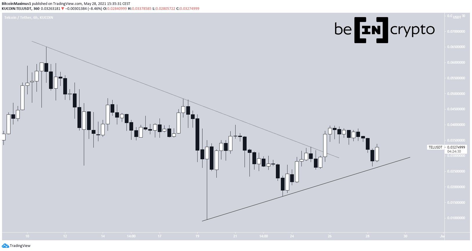 TEL had been following a descending resistance line (dashed) since May 4 when it reached an all-time high price of $0.0649. It broke out above this line on May 25.
