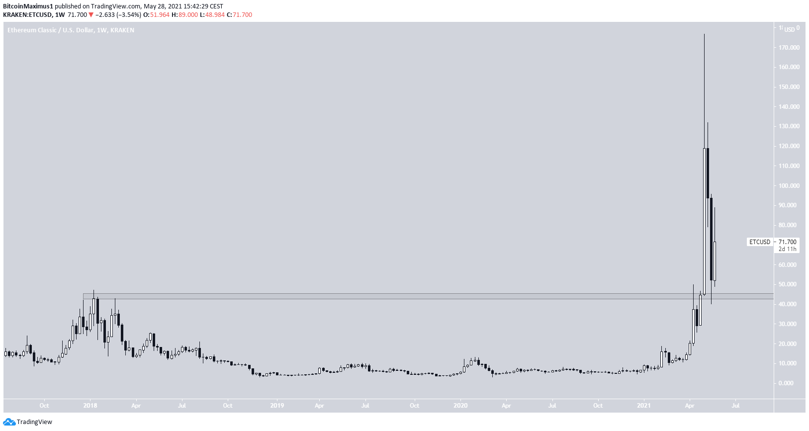 ETC has been falling since May 6. At the time, it reached an all-time high price of $176. The decrease validated the previous all-time high resistance area of $44.50 as support.
