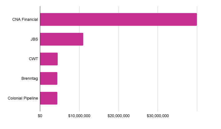 The largest ransomware payment — where an organization pays to have their software freed from a malware attack — was by CNA Financial. The Chicago-based firm paid $40m to a Russia-based hacker group.