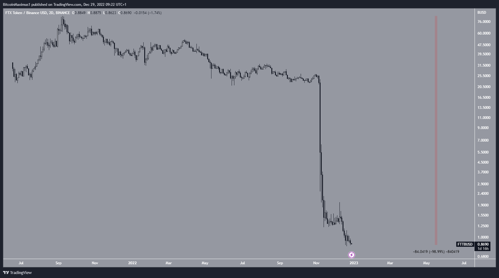 While it has not technically crashed to $0, the FTT price has fallen by 99% since its all-time high and is trading below $1. The crash began on Nov. 8, after rumors began to circulate that the FTX exchange is insolvent. Shortly afterward, the exchange declared bankruptcy. Sam Bankman-Fried, the exchange’s CEO is now facing legal proceedings.