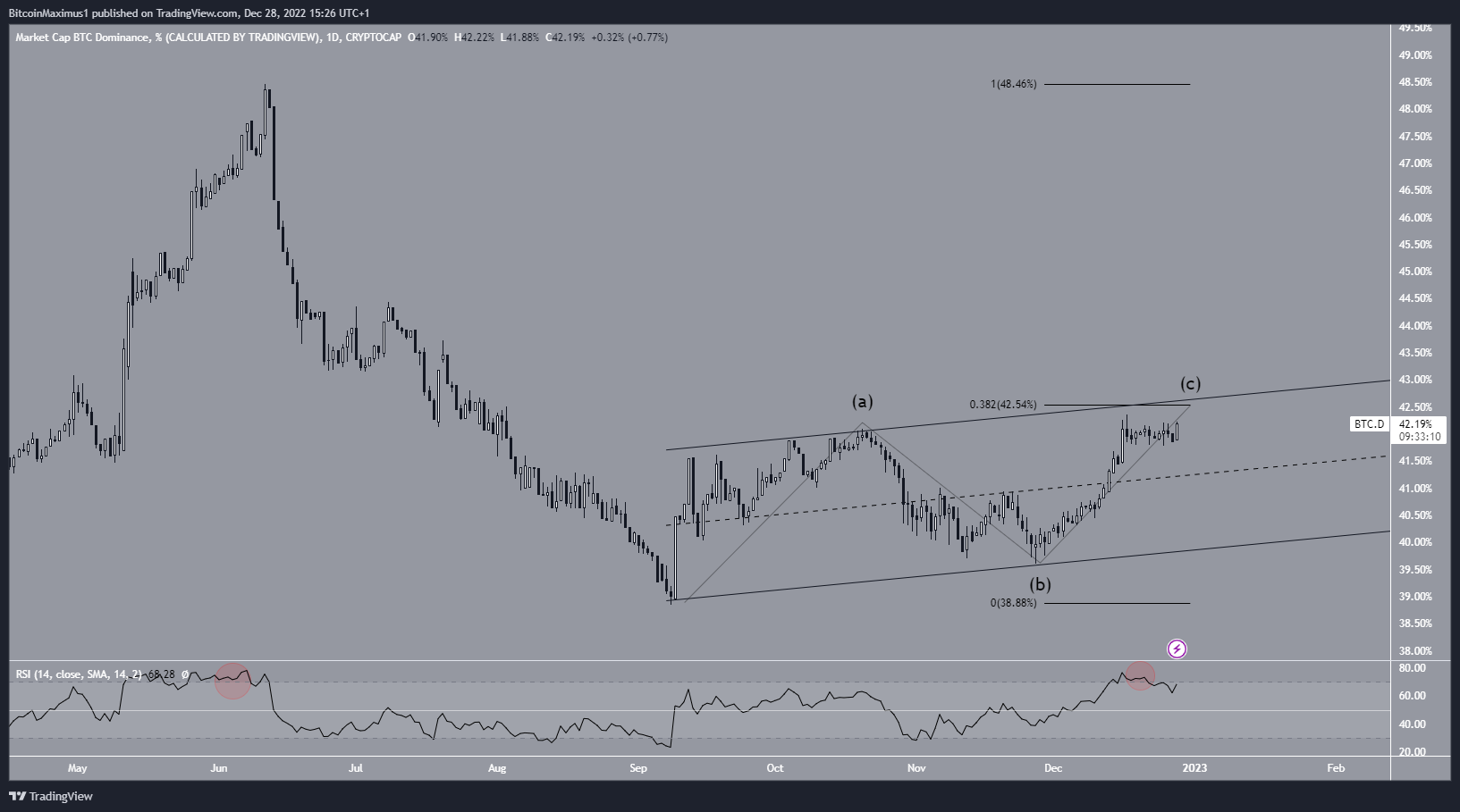 If the BTCD breaks down from the channel, it could fall toward its all-time low at 36%. Conversely, a breakout above the channel’s resistance line would indicate that the trend is bullish instead.