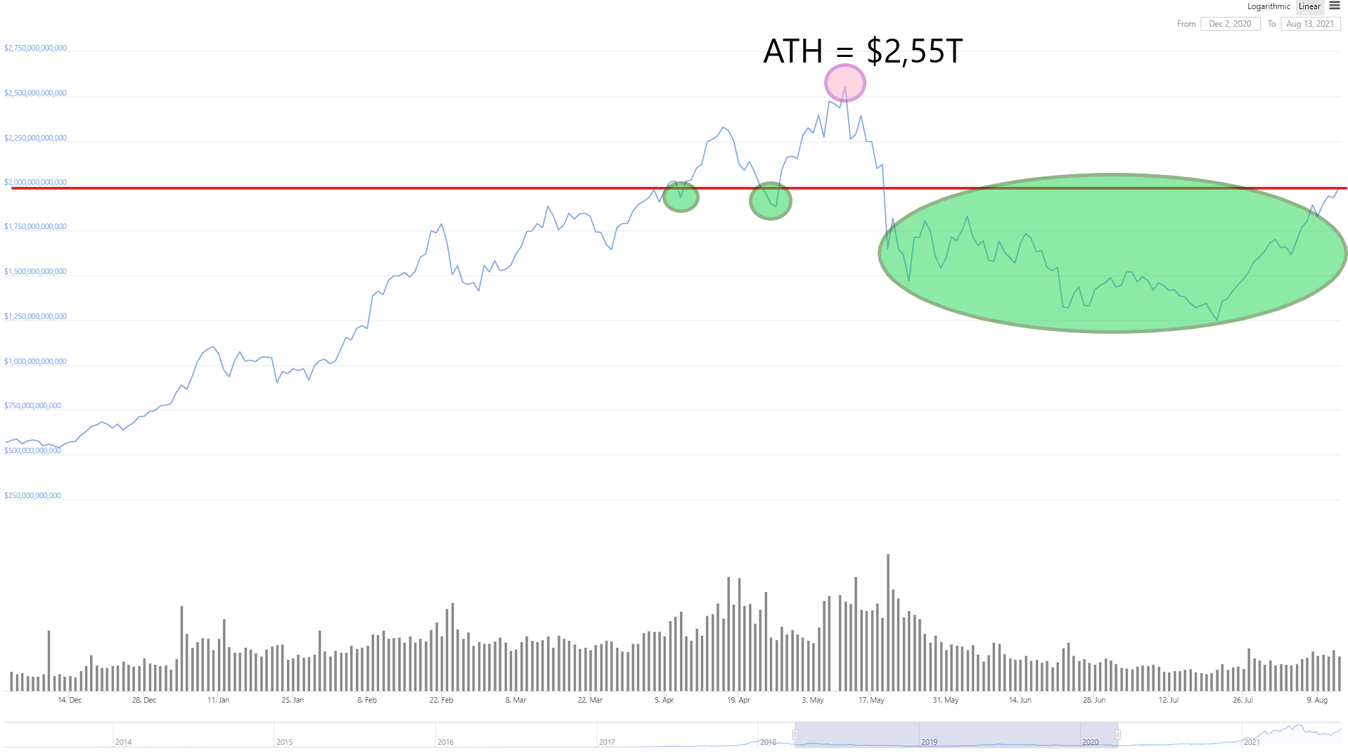 The third time also occurred during the same month, on 27 April, when the market made its last significant move to set a new all-time high. This happened on 12 May, with the total crypto market cap reaching $2.55 trillion (pink circle). Periods below the $2 trillion capitalization are highlighted in green.