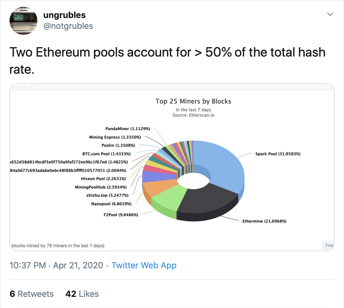 Despite the hashrate staying constant, there is now less and less competition among mining pools on Ethereum. According to the latest numbers, two Ethereum pools now account for over 50% of the hashrate. Ethermine and Spark Pool are the two leading mining pools on the network now, as ungrubles (@notgrubles) recently tweeted.