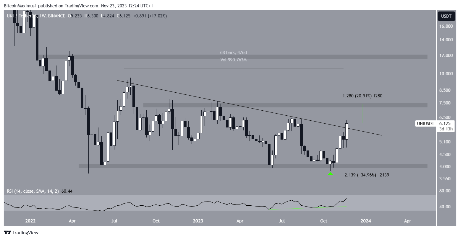 The bullish trend will be confirmed by a breakout from the long-term descending resistance trend line. If that happens, the UNI price can surge by 20% and reach the $7.40 resistance area. It could potentially move above the yearly high at $7.61.