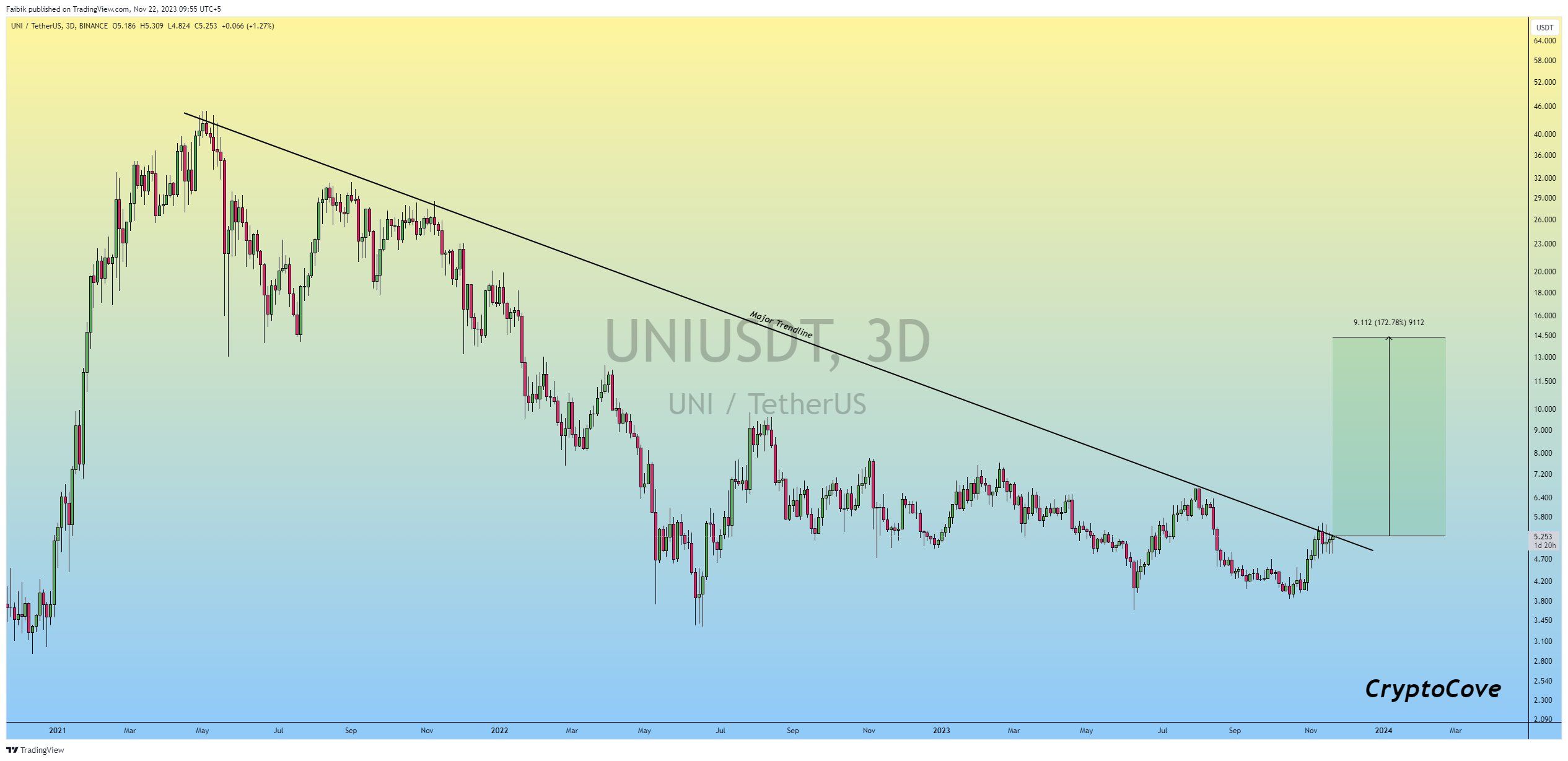Crypto Faibik believes that the trend is bullish since UNI is in the process of breaking out from a long-term descending resistance trend line.