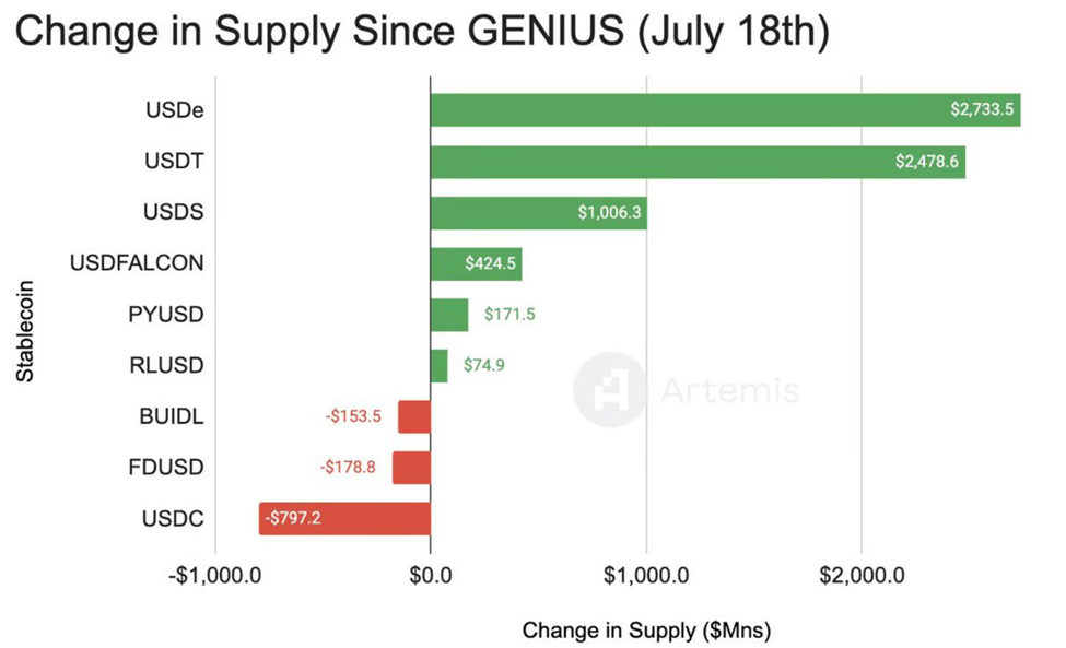 According to David Arnal, a researcher at Sentora (formerly IntoTheBlock), USDe added $2.7 billion in net new supply, the most among all stablecoins post-GENIUS.