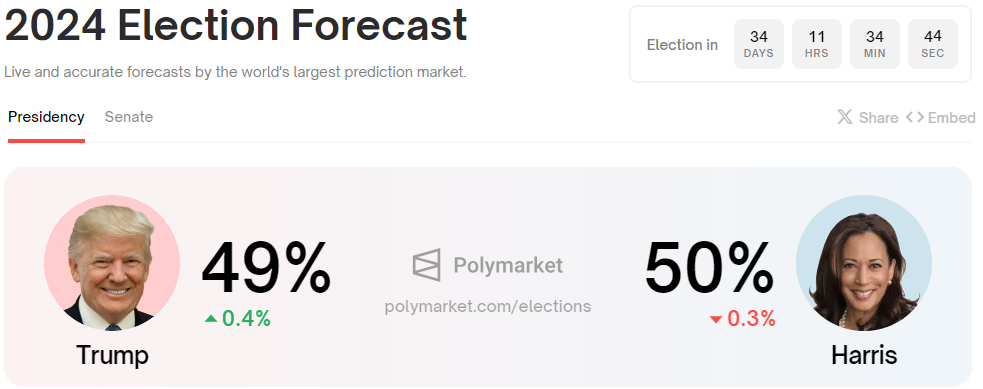 The report highlights the growing significance of crypto in U.S. politics. According to Polymarket data, Kamala Harris currently holds a narrow lead, polling at 50% compared to Trump’s 49%, with just 34 days left until the election.