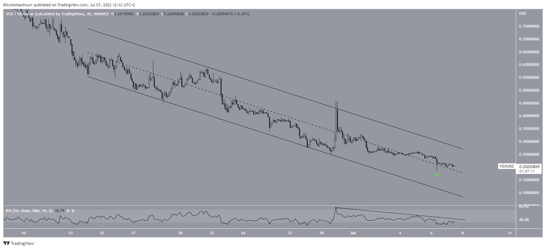 The two-hour chart shows that VGX has been falling inside a descending parallel channel since June 14. Such channels usually contain corrective movements, which would mean that an eventual breakout is likely. Currently, the price is trading in the upper portion of the channel, after bouncing at the midline (green icon) on July 6.